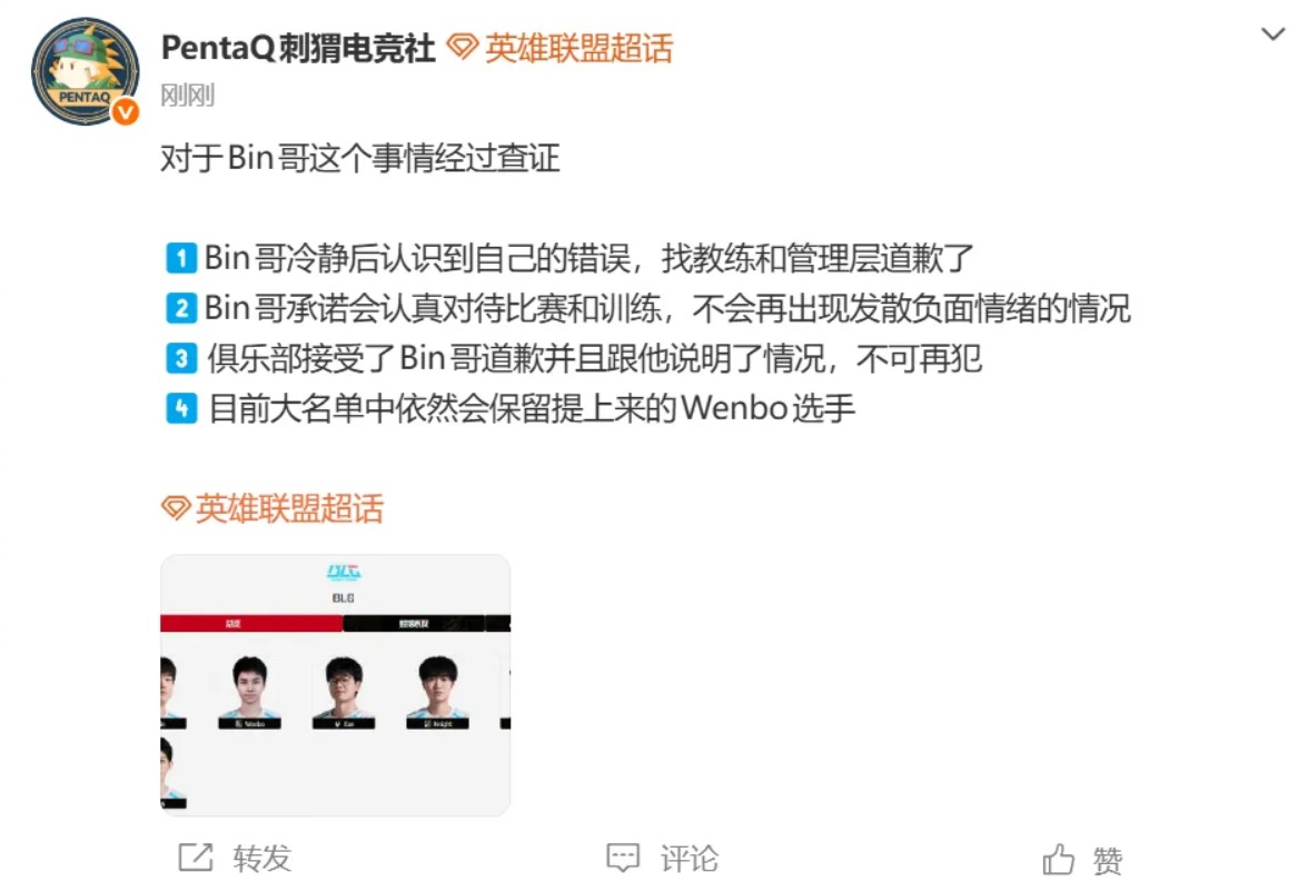 This was definitely wrong on Bin’s part. The latest reports show that Bin has admitted his mistake, apologized, and returned to the starting lineup, while the newly promoted top laner Wenbo remains on the team.