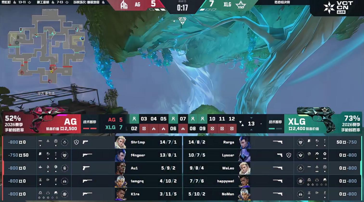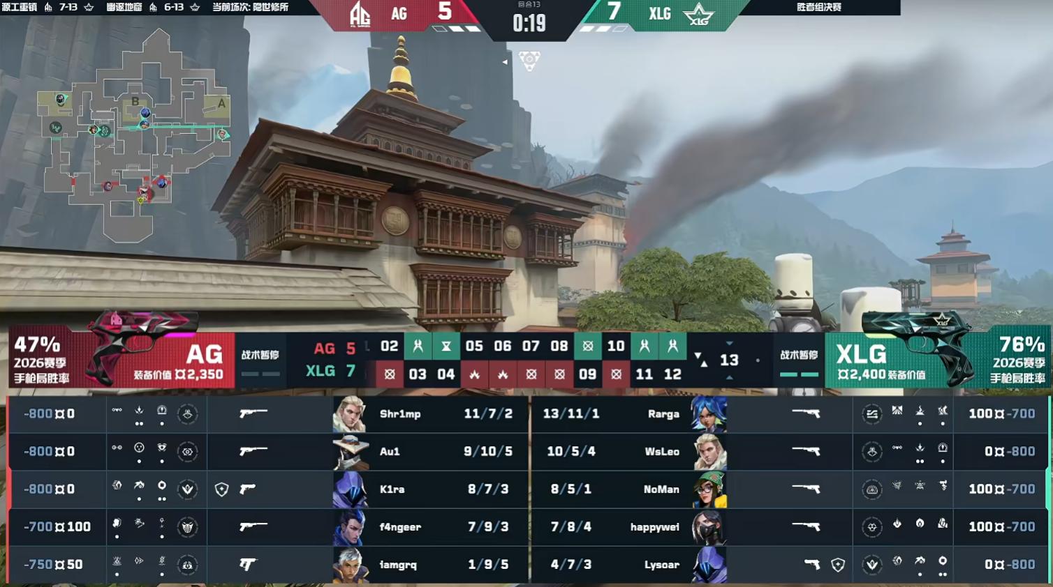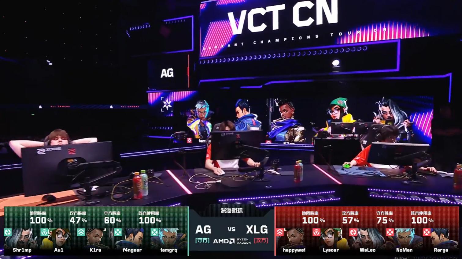 AG won the pistol round in the first half. In round 3, after XLG’s bonus round, AG infiltrated mid to A second floor, where K1ra secured a triple kill to win XLG’s bonus round.