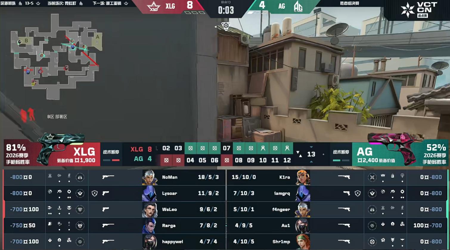 AG opened the first half with four straight wins. In round 5, XLG faked left and attacked B through mid, breaking AG’s defense to claim the round.