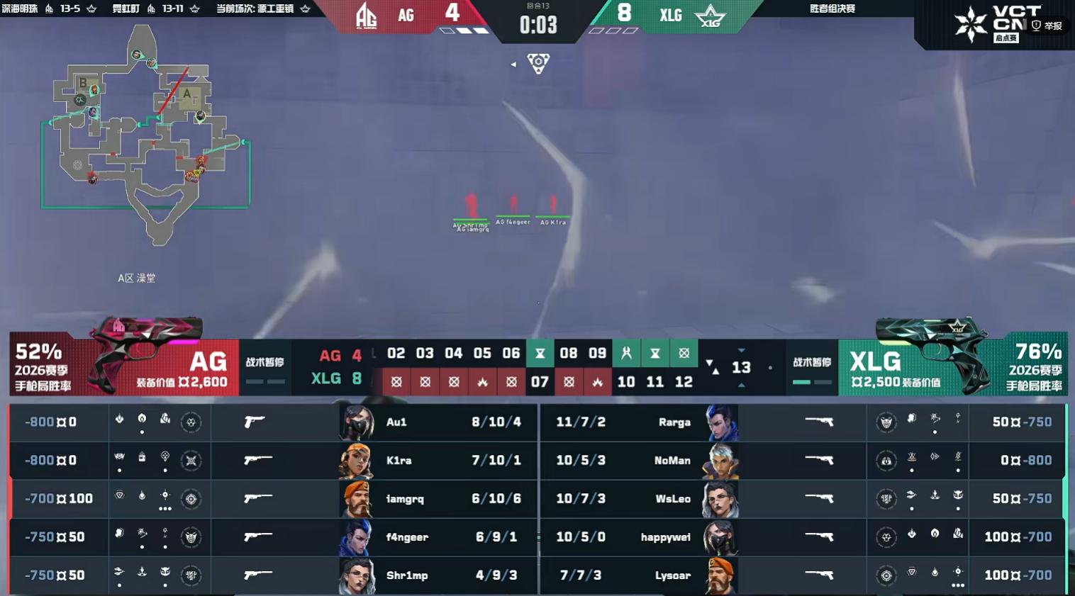 In round 8, AG’s retake of A point failed; XLG remained steady in clutch situations and continued to score.