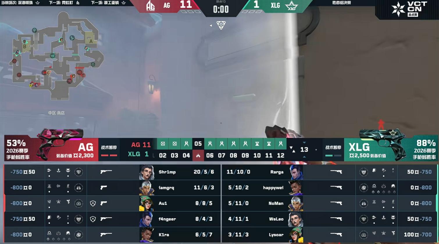 K1ra’s continuous impact led AG to tie the score at 10-10. In round 21, after K1ra was first killed, AG struggled without smokes to enter the site, forced a double fake push, but Rarga’s trap stopped them; Au1 and Shr1mp held a 2v4 retake to secure the round for XLG.