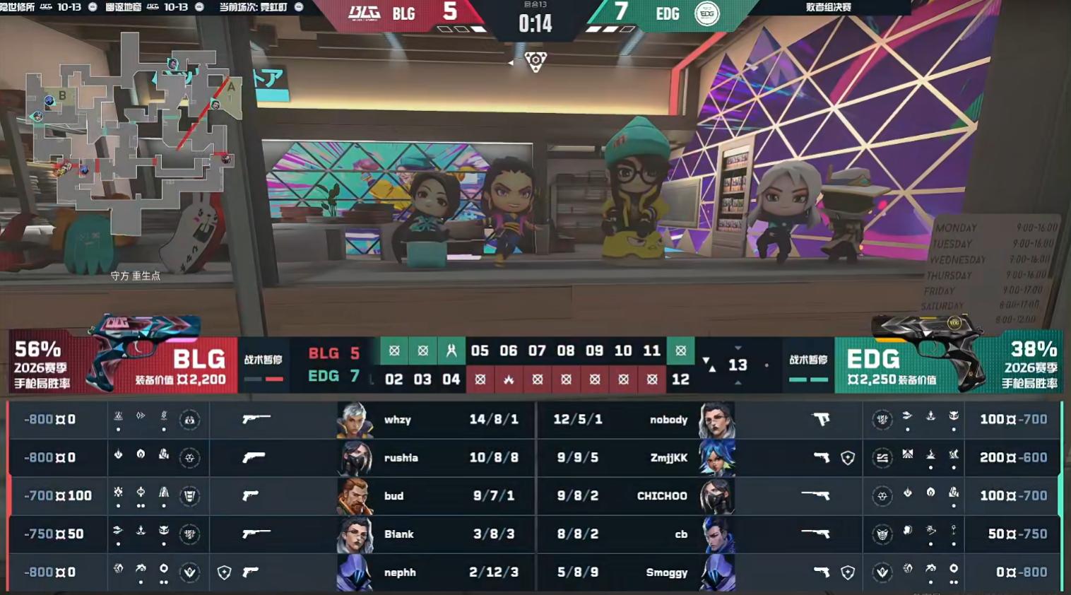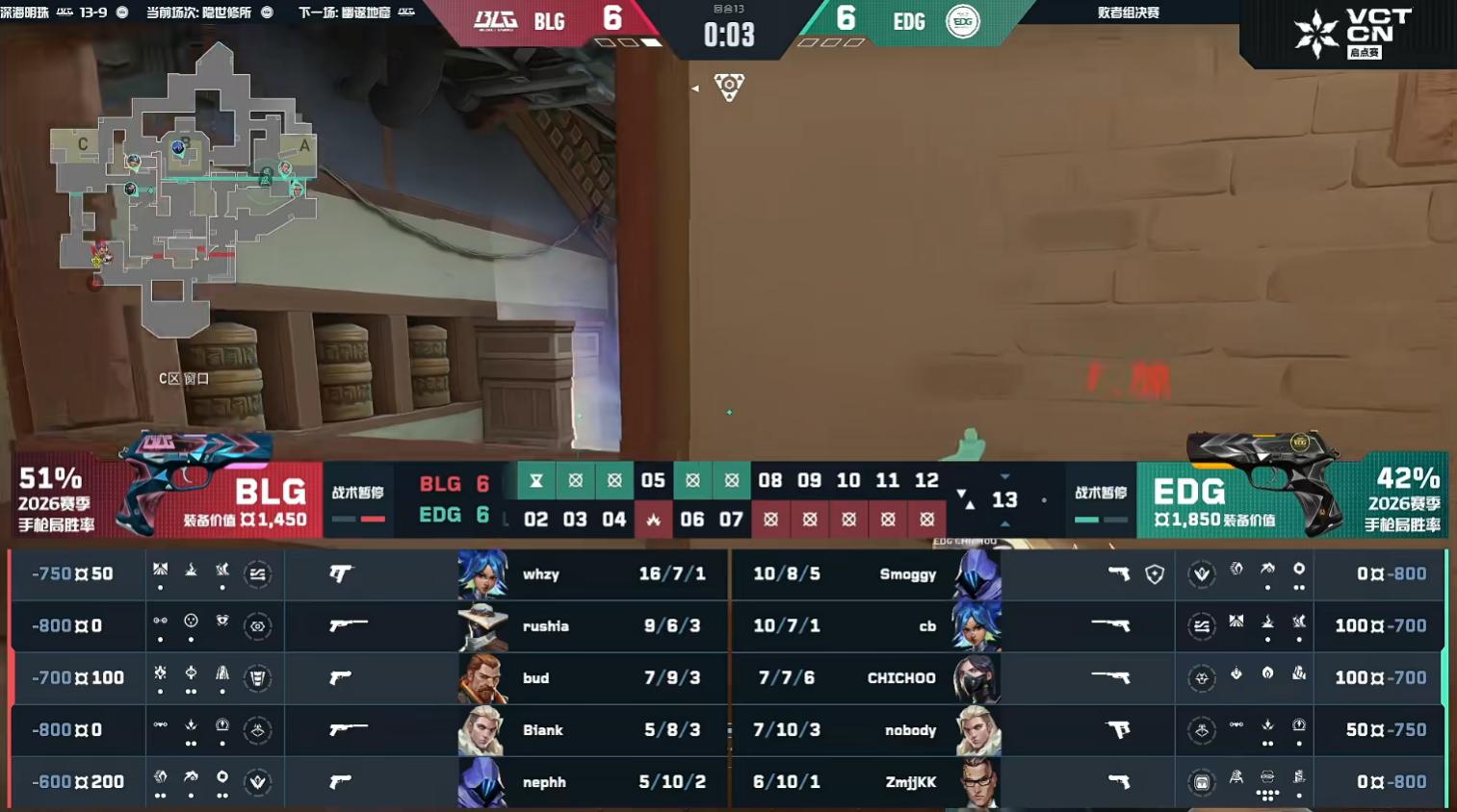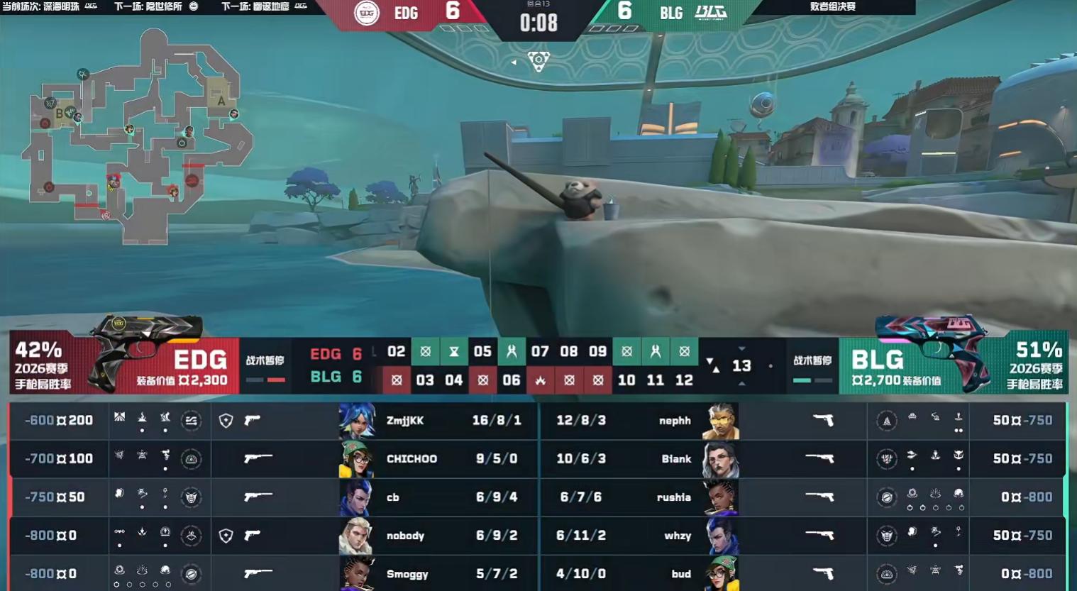 BLG took the lead. In round 11’s A site attack and defense, QiuQiu and Smoggy defended successfully, stabilizing EDG’s position. Then Kangkang and Neon executed a flank with Yoru’s four kills to stop BLG’s attack. The half ended tied 6-6.