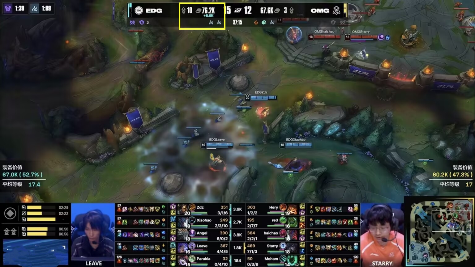 Before 20 minutes in the first game, EDG maintained an economic lead. At a critical moment, Da'an pushed a lane without vision, giving OMG a big opportunity. Even with their mid laner dead, EDG tried to teamfight, but four players lined up and ended up giving a team wipe. Despite OMG's amazing play, when they led by 4.4K gold, they overcommitted in a numbers disadvantage and gave EDG the advantage back. When EDG had a chance to win, Leave walked into the enemy and threw the game away.