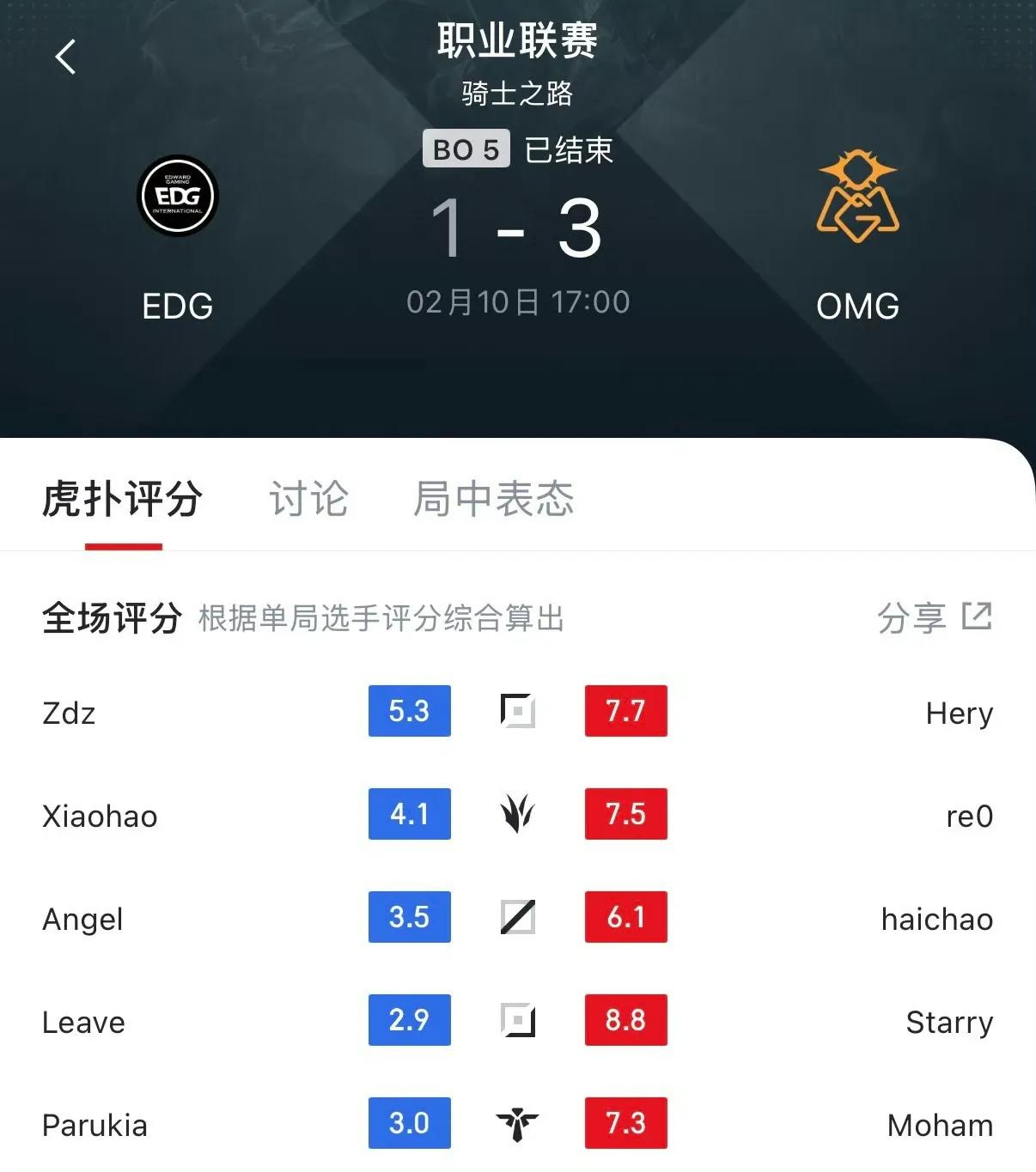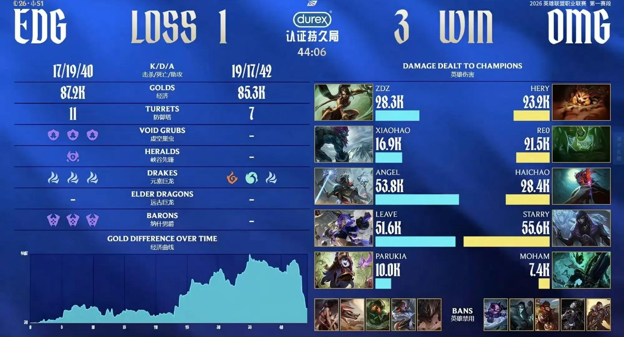 The match against OMG was critical; losing would mean immediate elimination and the end of the first stage. The first two games were fairly competitive. Especially in EDG's first game, they held a stable position for 40 minutes and nearly turned the tide, but the AD carry gave away the lead. The second game was a mid-game domination by OMG despite lasting 37 minutes, with OMG maintaining control. The third game was EDG's most solid, with a 7-0 jungler leading the team to even the series smoothly, with a steady economy curve and few issues.