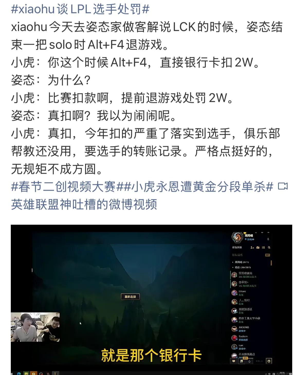 Later, Zitao also had a solo match, and at the end of one game, he pressed Alt+F4 to quit. Xiaohu immediately commented that pressing Alt+F4 now costs 20,000 RMB from your bank account. When Zitao asked why, Xiaohu patiently explained that the fine is for quitting early during matches. This year, penalties have become much stricter. Even if the club pays, players must provide transfer records. The rules are tighter, which is good—no rules, no order. Many players have done this before; even 369 was fined 5,000 RMB for early quitting when he was with JDG. Now the fine has quadrupled.