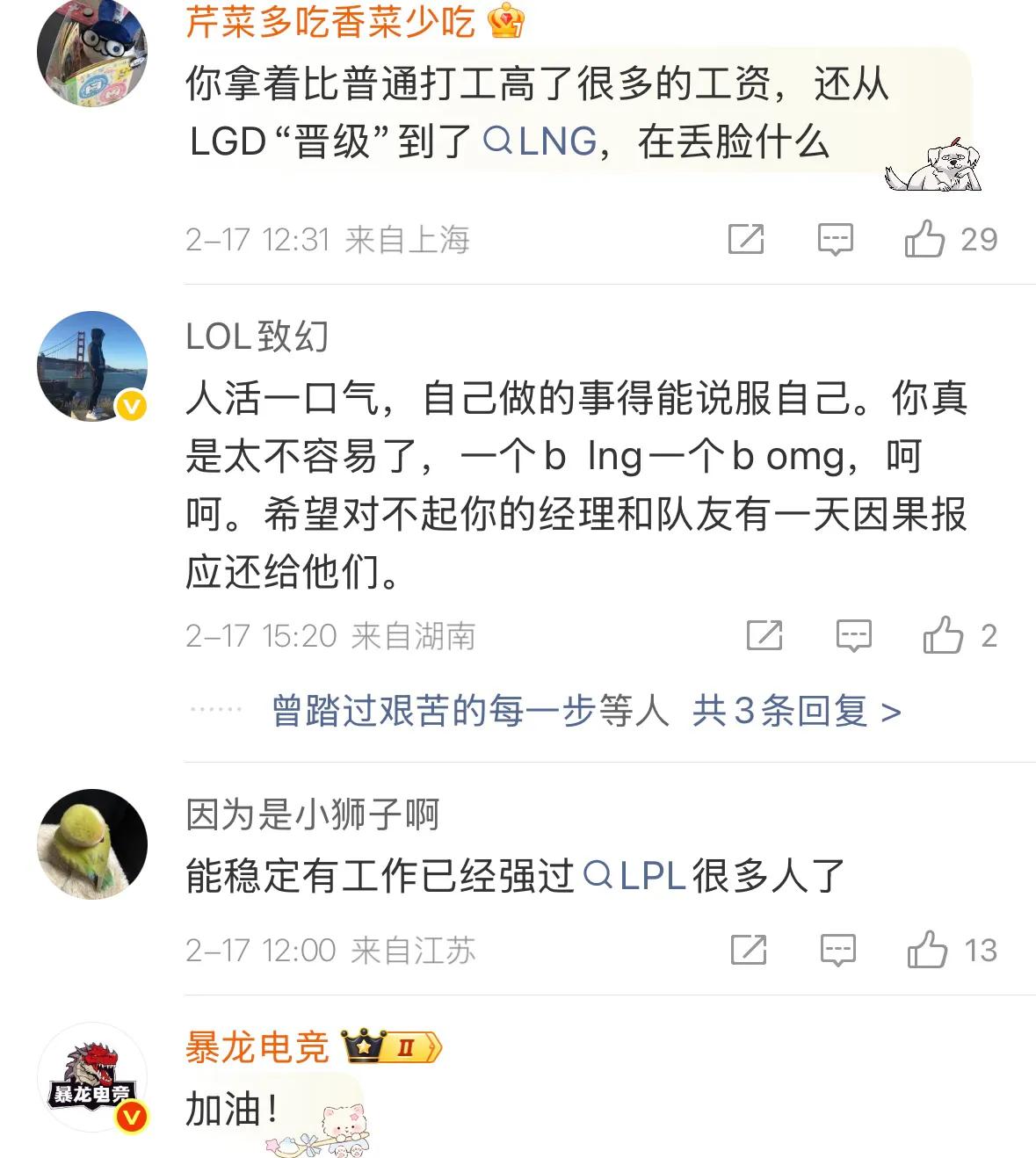 Top liked comment: "You earn far more than ordinary workers and have progressed from LGD to LNG—what’s there to be ashamed of?" Even former LPL official commentator Zhihuan commented below: "Life is about spirit; you must be able to convince yourself of what you do. You’ve had a tough journey." Honestly, making it to LPL at 19 is already a huge success, surpassing at least 90% of peers. Keep in mind, the LPL’s minimum salary is around 20,000 RMB, and any player with some recognition earns even more. Think about how many regular workers earn that in a month. There’s absolutely no need for such low self-esteem.