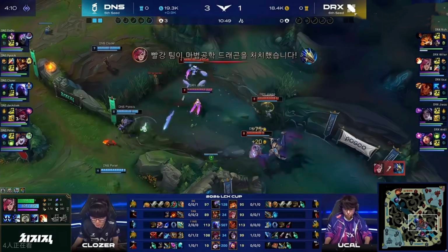 After DRX’s bot lane was crushed early, Pyosik didn’t prioritize dragon control. By 11 minutes, DRX had already taken two small dragons. The ocean drake was lost due to an overextension by the top laner, and DNS hesitated to engage. In the final dragon soul fight, although all players were present, DNS lost the teamfight. DRX secured the dragon soul and Baron, completing a comeback. Despite bot lane advantage, DNS failed to secure dragons and kept losing teamfights despite their gold lead. Their performance was utterly uncharacteristic.