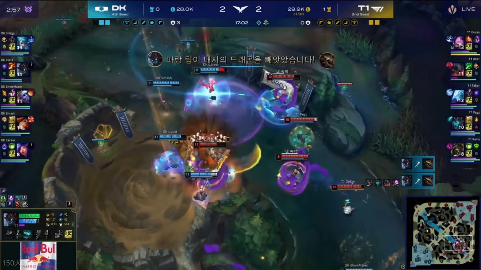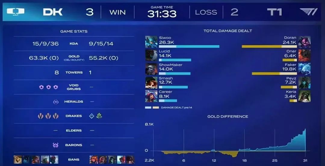 In the first split LCK playoffs, only two BO5 matches remain to conclude the event. On the last match day, T1 in the lower bracket went up against DK. Pre-match expectations were that T1, having prepared extensively, would comfortably beat DK and reach the lower bracket finals. After taking the first two games 2-0, everyone thought it was secured, but the top, mid, jungle, and ADC all faltered in the last three games, enabling DK to overturn the series 3-2 and eliminate T1.