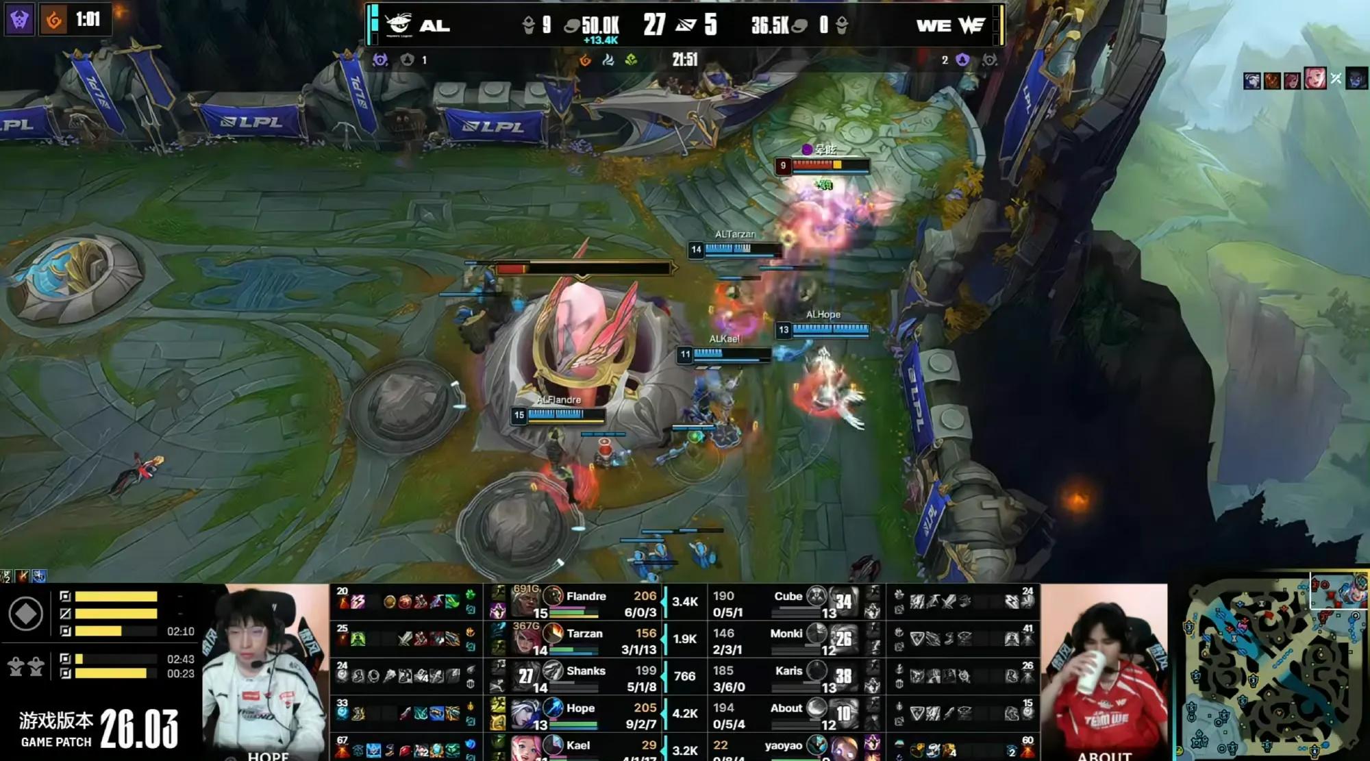 Throughout the first phase of the regular season, AL maintained a very steady pace, comfortably securing first place without much disruption from coaching changes. In the playoffs, they strategically chose the weaker WE team as their opponent. The series was smooth, with AL sweeping WE 3-0 to advance. In the first game, just three minutes in, a 2v2 jungle-mid clash erupted, where AL calmly secured a 2-for-0 exchange, establishing an early lead. Later, jungler Tarzan’s individual skill widened the gap, ending the game at only 26 minutes.