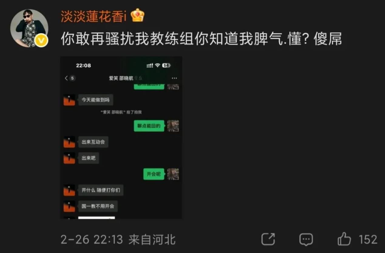 The result was that AL lost to JDG after five grueling games. JDG's owner, Blue Lotus, didn't hold back. First, he commented under Aixiao's jersey giveaway post: "How's it going, Aixiao? I want to do a giveaway too." Then, around 10 PM, he commented again, directly calling Aixiao an idiot and warning, "If you harass my coaching staff again, you know my temper," essentially blowing up at him.