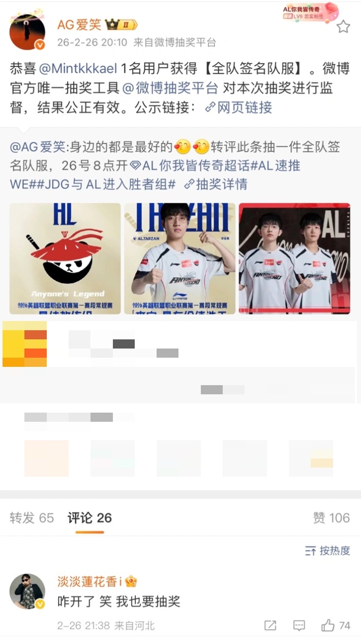 Everyone thought AL would win, including AL's manager Aixiao. This widely recognized drama queen started celebrating before the match even began. First, he posted a Weibo giveaway for lucky fans to win AL team jerseys, scheduled for 8 PM on the 26th—exactly when the AL vs. JDG match was set to start, implying AL would finish the fight by then.