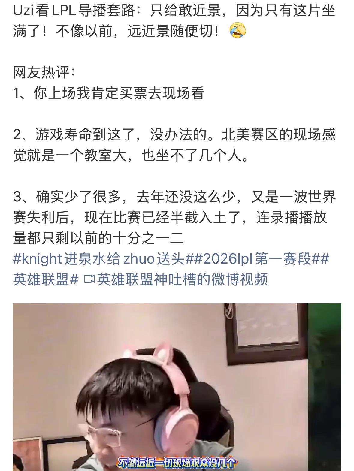Introduction: The S16 season has officially begun, and it is believed that the majority of players have been following the recent matches. The competition in the LPL region has been extremely intense. The start of the playoffs has boosted the league's overall popularity, but it completely lacks the roaring cheers of the past. It's unclear whether fans still remember the pre-match chants and cheers, which used to be overwhelming and passionate. Now, it feels like the same group of people are cheering for both teams, and likely some of them are staff members. During a live stream, Uzi pointed out the current issue, explaining that directors used to pull back for wide shots to show the entire live audience. Now, because there are hardly any people, they can only zoom in for close-ups, focusing on the one small section that is filled.