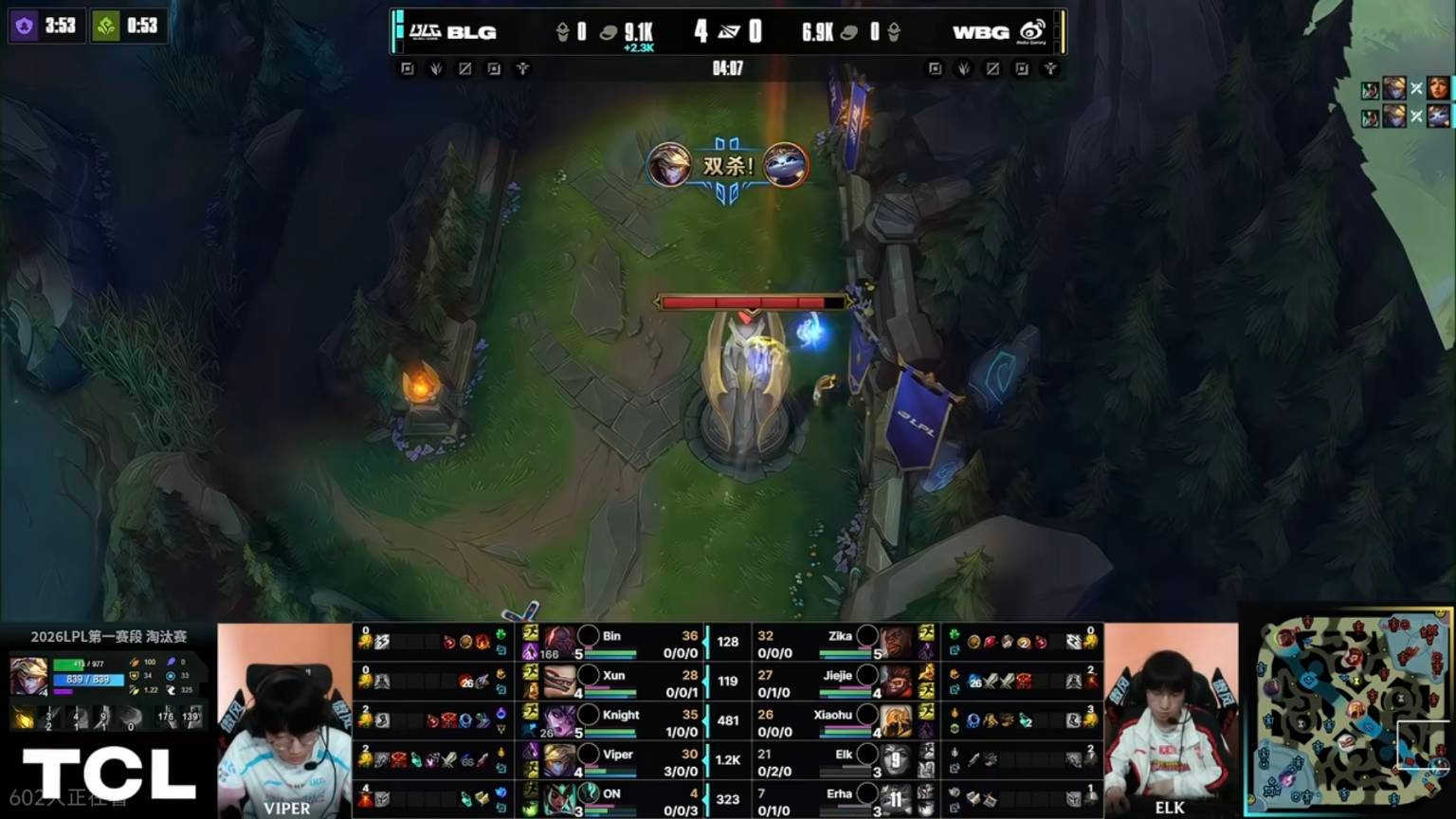 It seems WBG just had poor luck. Without the bug, they likely would have secured at least one game win. The following two matches became one-sided. In game two, WBG's bottom lane and jungle collapsed in under 5 minutes, with the kill score at 5:1 and a nearly 2k gold deficit, effectively ending the game early. The third game was even more extreme: ELK got killed in lane early, followed by failed skirmishes in the bottom side, resulting in a 4:0 kill lead and over 2k gold disadvantage for BLG around the 4-minute mark.