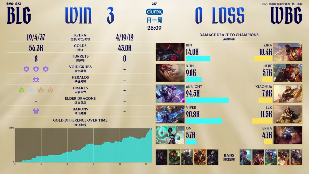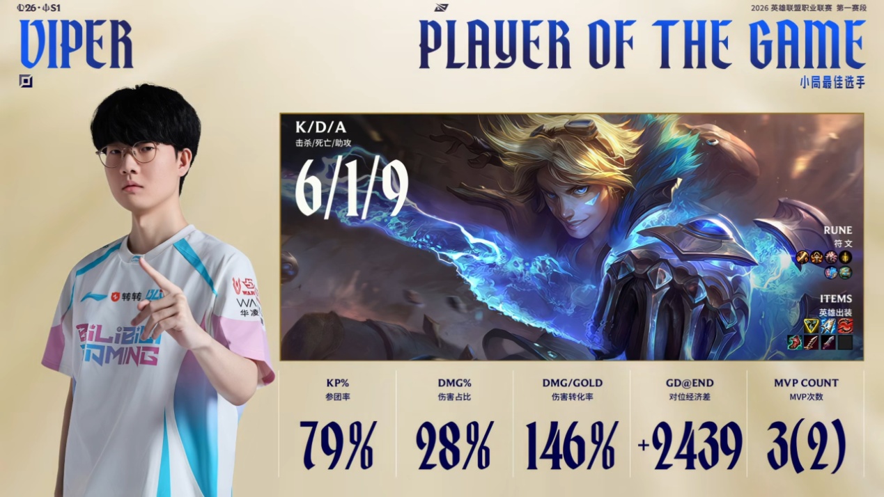 However, come playoffs, BLG直接 dominated the all-Chinese team WBG, and Viper used his outstanding performance to demolish WBG's bottom lane, showcasing the strength of BLG's roster.