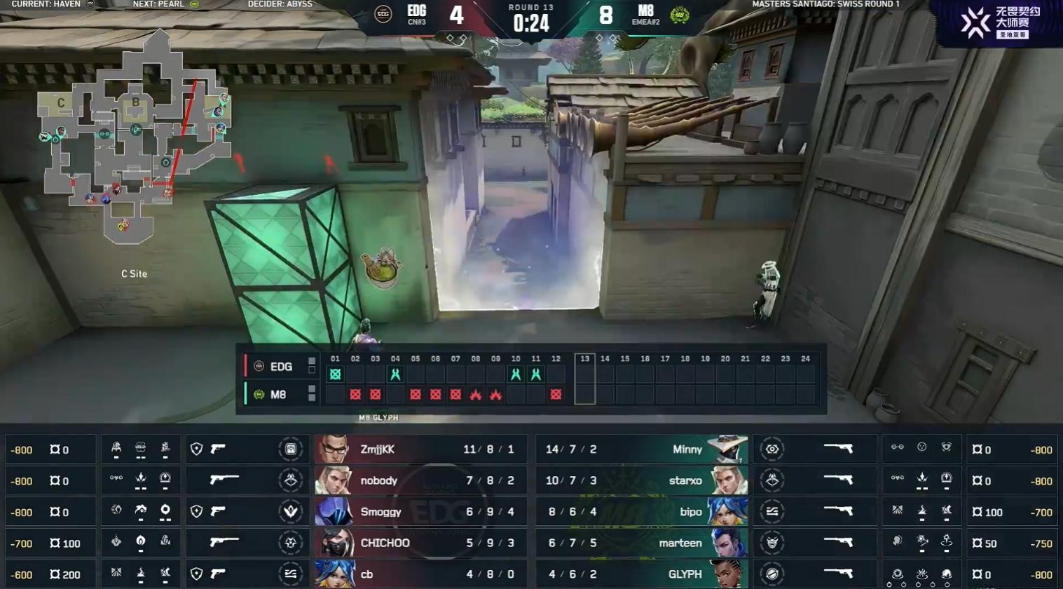 In round 24, EDG's methodical push was picked apart by M8. In the final round, M8 successfully seized their chance to defeat EDG. M8 won Haven 13-11.