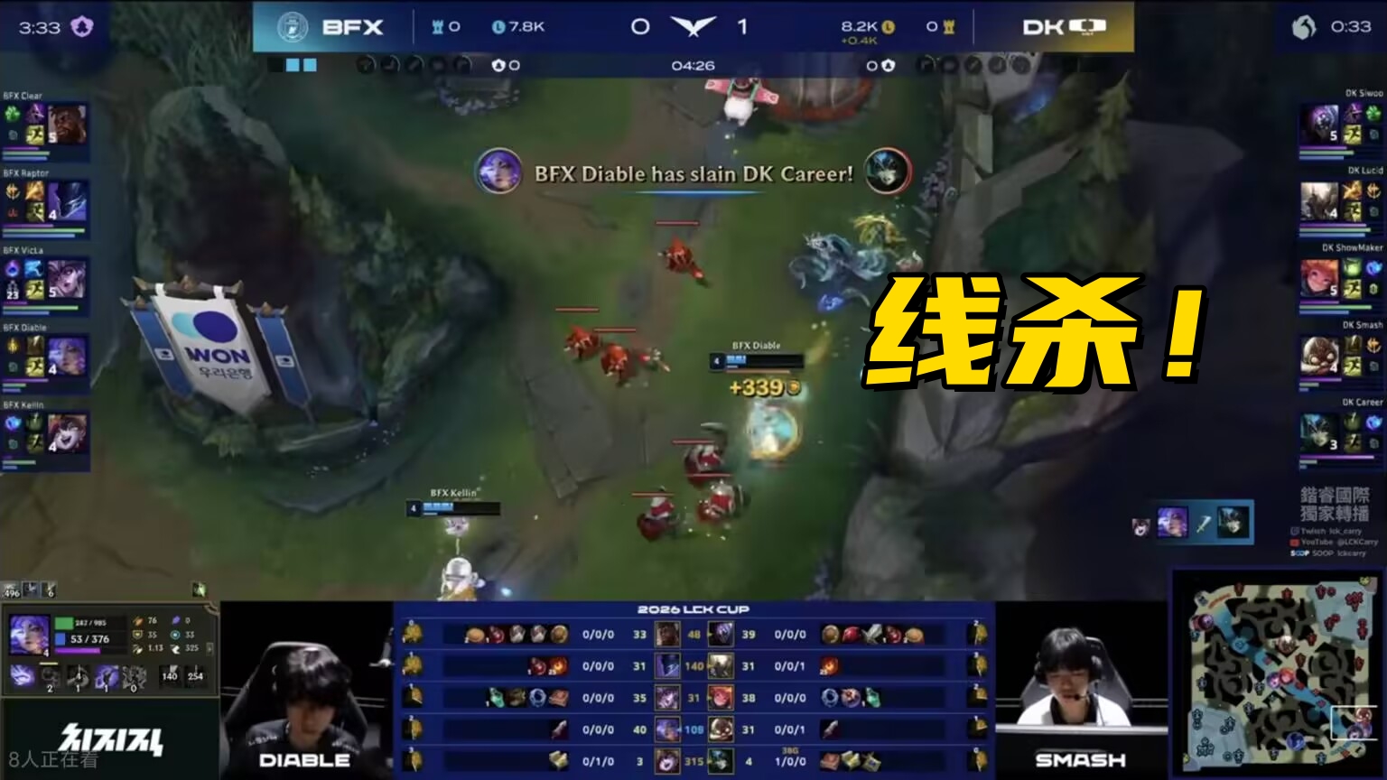 The third game highlighted the largest bot lane gap. Just two minutes in, DK's jungler helped secure first blood for their bot lane, but by the four-minute mark, the bot lane had been killed in a 2v2. Afterwards, both junglers repeatedly focused on the bot side. Despite ShowMaker's 2-0 Corki, he had minimal impact in the mid-game. DK's team fights again fell apart easily, while Diable aggressively dominated, single-handedly chasing down four opponents. Ultimately, BFX swept DK 3-0 to advance to the finals.
