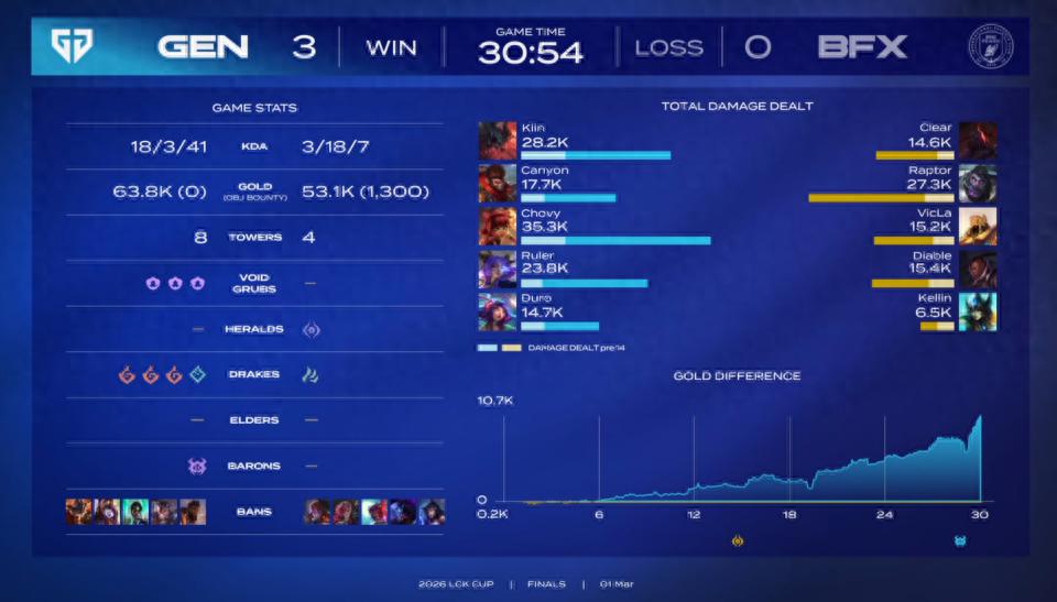 In recent LCK years, it has largely felt like Chovy's era. Entering 2026, that era continues, as his return to the LCK always brings absolute dominance, no matter his prior form. During the LCK Cup finals, against the newcomer squad BFX—a dark horse that fought its way up in the LCK—GEN was relentless, easily sweeping the series 3-0. Each game was a complete overpowering display! With this win, GEN secured the number one seed for the Vanguard Cup, while BFX will attend as the second seed. For this rookie team, the performance they've shown means the LPL must stay vigilant against them in the upcoming Vanguard Cup!
