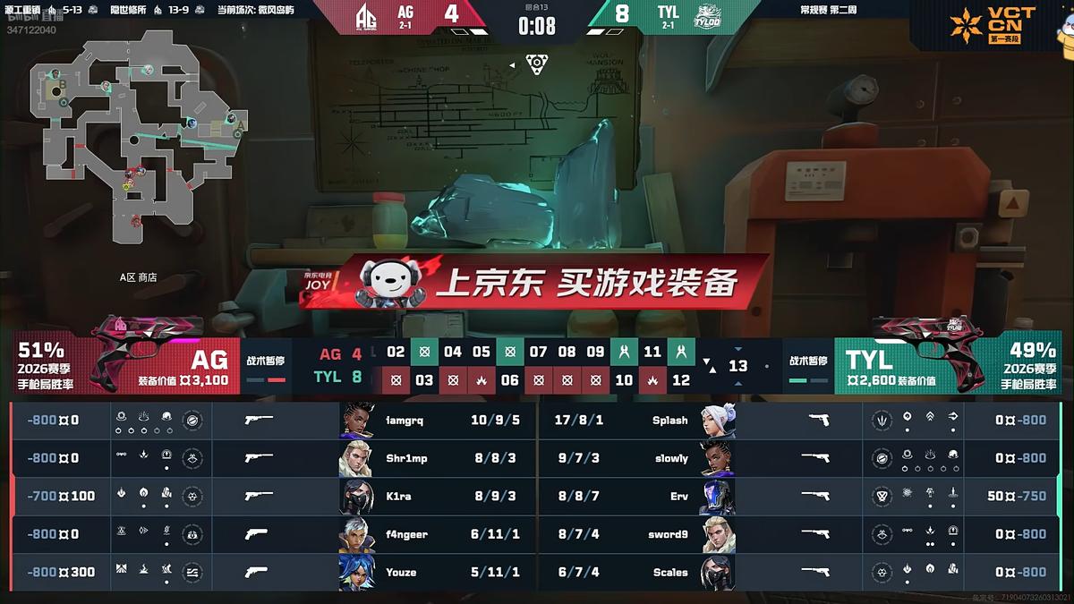 In round 7, AG won the gunfight to reclaim a point. In round 8, Splash immediately eliminated two opponents to gain a numerical advantage, and his teammates followed up with successful gunfights, allowing TYL to secure this point.