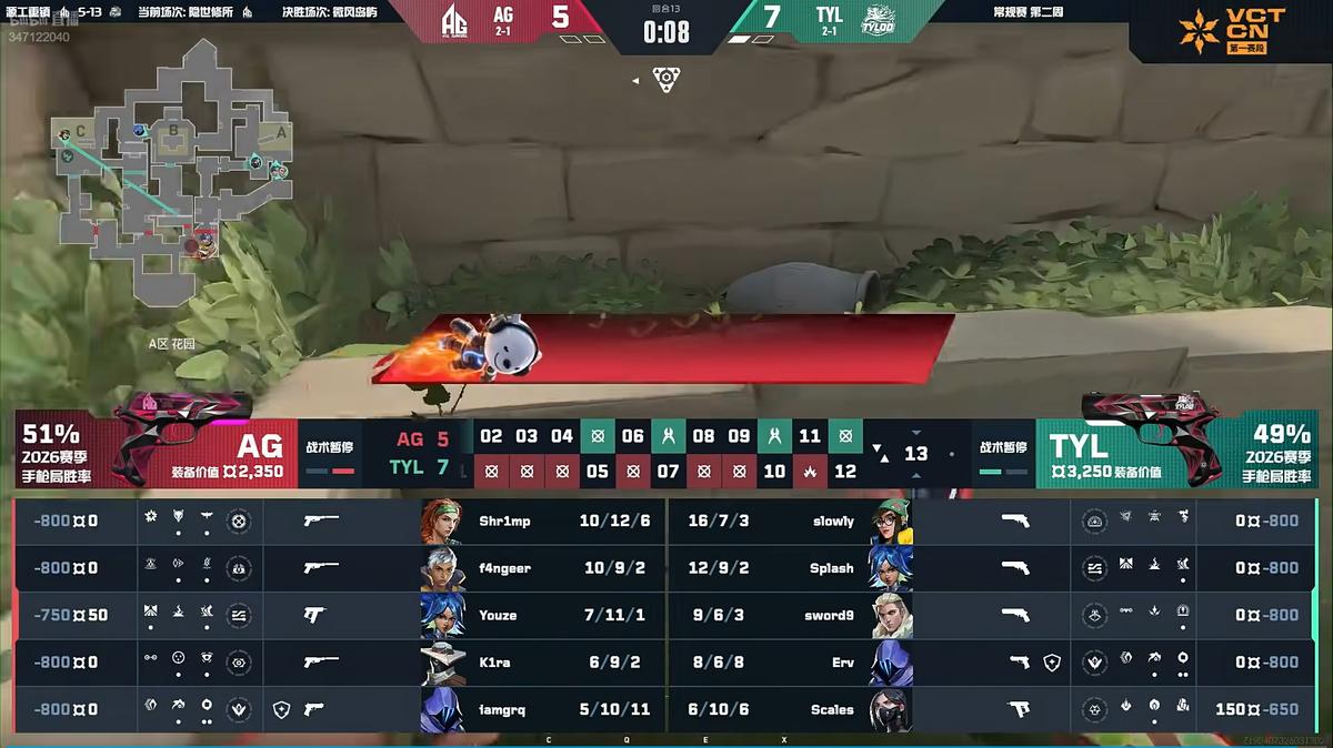 In round 8, Splash's quadruple kill helped TYL secure another point, widening the gap to four points, prompting AG to call a pause.