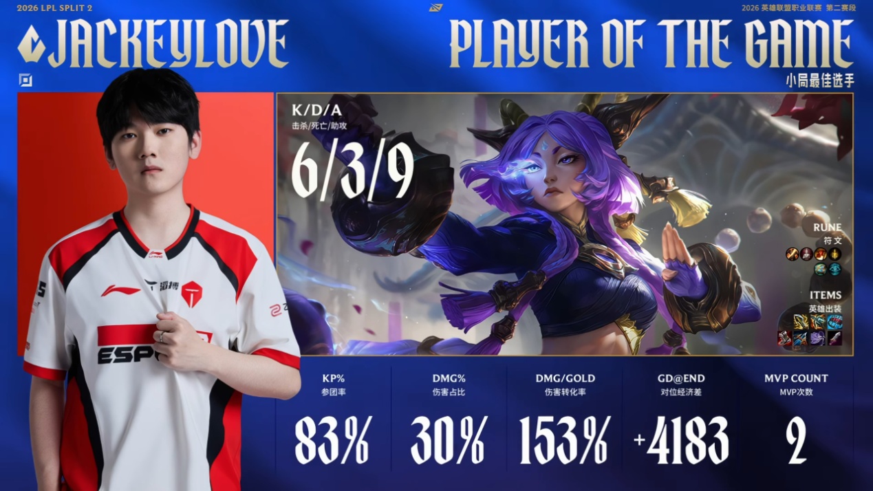 JDG later seized an opportunity top lane to kill an inexperienced Jayce, then started Baron to force a fight. TES countered with four versus five, JKL stepped up, performing extreme kiting at low health alongside teammates to win the fight, then ended the game in the next push. This game, JKL performed consistently throughout, earning MVP, while Tian's Jarvan IV also played a crucial role.