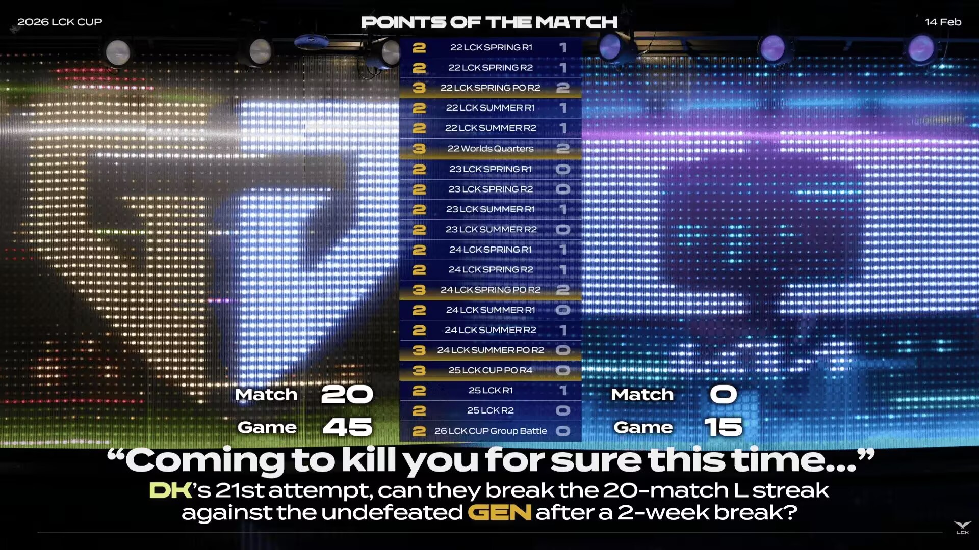 Another match on the same day was DK versus GEN, which also turned out to be an upset. Before the match, all spectators and even commentators did not favor DK, because the previous encounter record between the two teams showed DK with twenty-one consecutive losses. Since the Spring Split of 2022, DK had never won against GEN. Everyone thought GEN would achieve a 22-win streak, but suddenly Chovy agreed, and the whole team performed poorly, being directly swept 2:0 by DK.