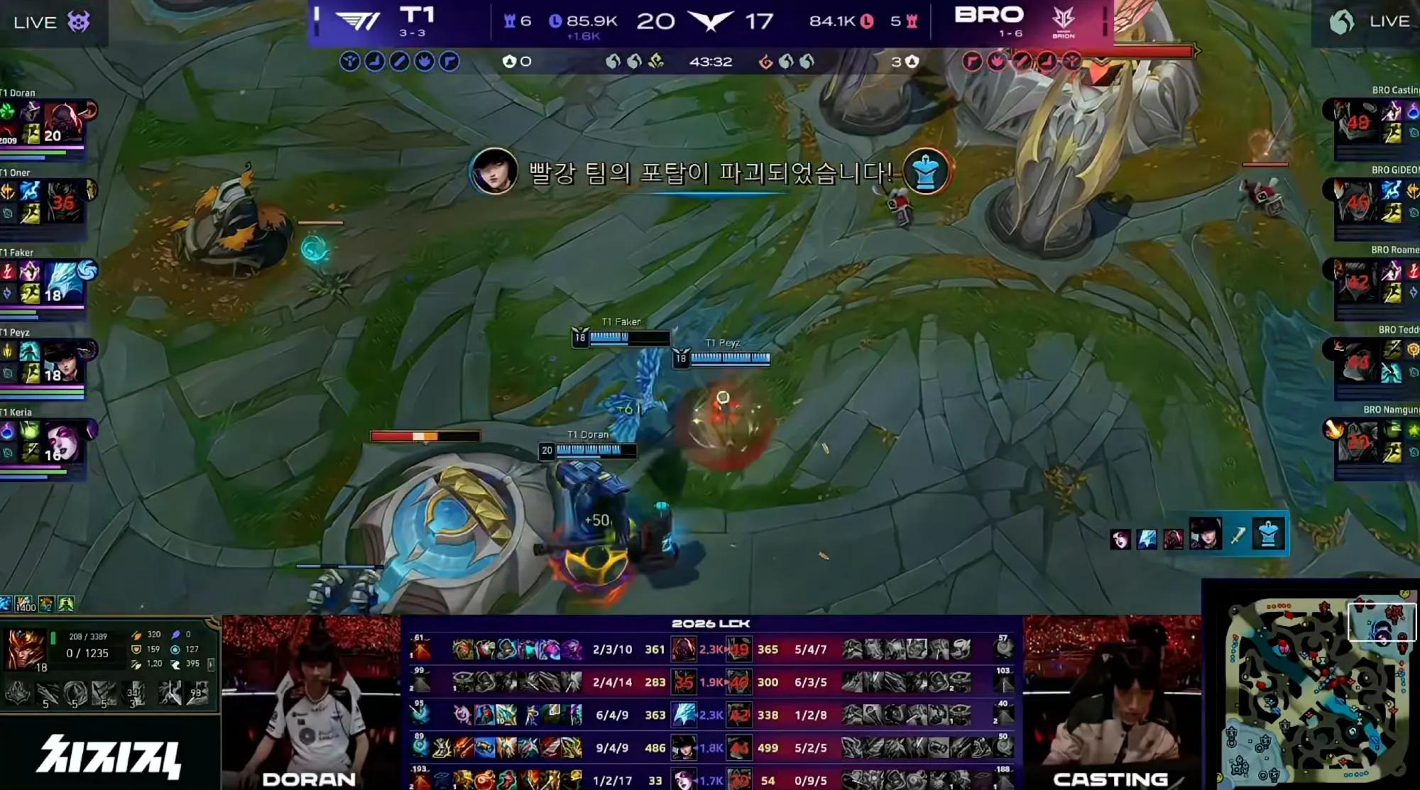 The second game was even more thrilling. For the first 20 minutes, both sides returned to classic strategic play. At 22 minutes, BRO initiated a fight resulting in a one-for-three trade but remained economically behind. However, at 24 minutes, T1's flawless four-for-zero exchange allowed them to instantly seize the Baron. Subsequently, while pushing with Baron buff, T1 was counter-attacked by BRO, leading to a back-and-forth battle with constant exchanges. The match finally concluded at 43 minutes, with the economic graph repeatedly fluctuating. True to T1's home game atmosphere, BRO appeared genuinely reluctant to secure victory even when holding advantages.