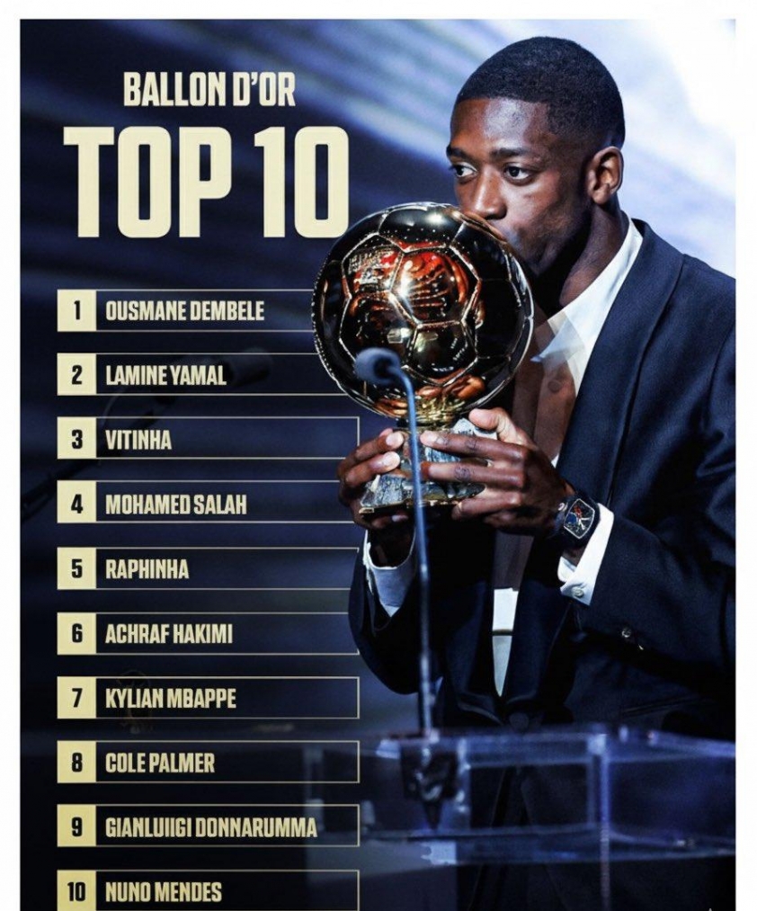 Right behind him is the prodigy Lamine Yamal, only 18 years old but already a key player for Barcelona with numerous brilliant performances. In third place, Vitinha impressed with his consistency and influence on the game, while Mohamed Salah demonstrated his class in fourth. Dembele’s Barcelona teammate Raphinha ranked fifth, and Achraf Hakimi (6th) showed his importance to both PSG and the Morocco national team.