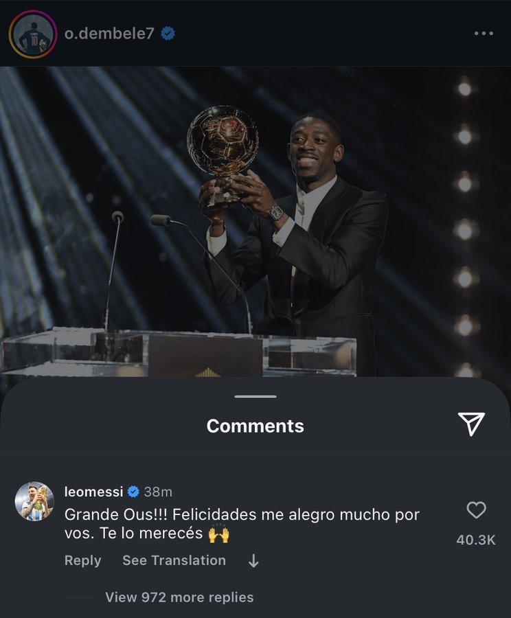 Right after the award ceremony, Messi posted a brief but meaningful message to Dembélé on his personal Instagram: “Grande Ous. Parabéns, estou muito feliz por você. Você merece.” (Translated: “Wonderful, Ousmane. Congratulations, I’m very happy for you. You truly deserve this.”).
