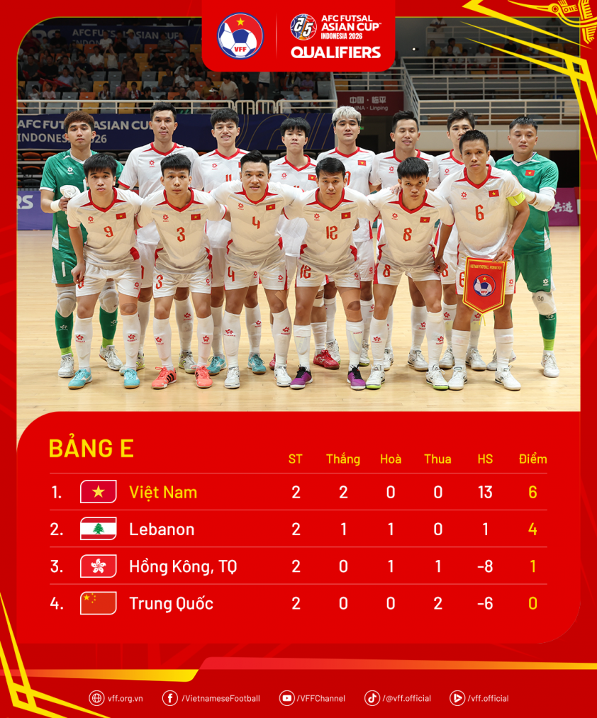 In the 2026 Asian futsal qualifiers, the 8 group winners and the 7 best runners-up will qualify for the finals. Vietnam holds the advantage of needing only a draw to guarantee first place. Meanwhile, if Lebanon fails to beat Vietnam, they will be eliminated.