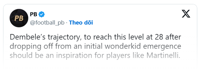 Dembele went through a tough period at PSG in the 2023/24 season, scoring only 3 goals in Ligue 1, before exploding in the next season with 35 goals and 16 assists. This transformation proves that a football career is never linear. This fact has opened new hope for those once doubted, including Martinelli.