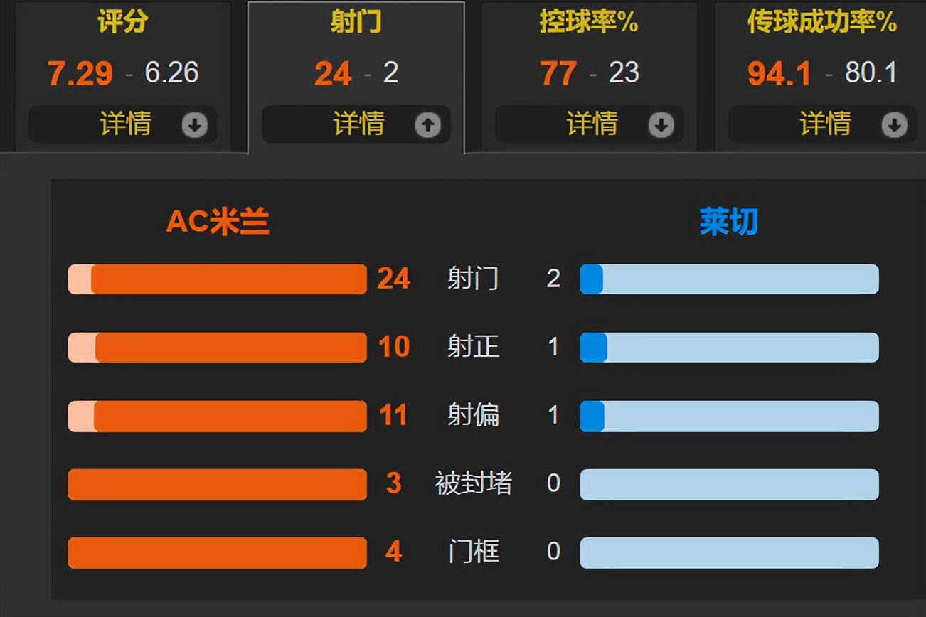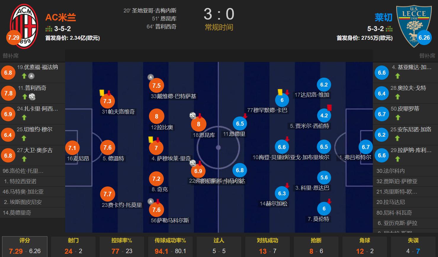 Match statistics further illustrate that this game was completely one-sided,Milan held 77% possession and fired 24 shots, 10 on target; Lecce managed 2 shots with 1 on target.