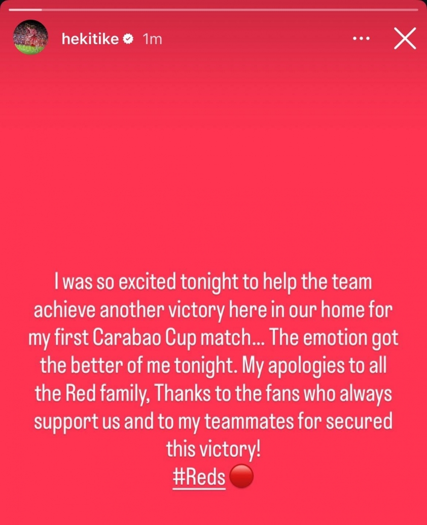 On his personal social media, he wrote: “Tonight I got overly excited helping the team secure another win at our home, in my first Carabao Cup game. Emotions got the better of me. I apologize to the entire Reds family. Thanks to the fans for their constant support and to my teammates for achieving the victory together. #Reds.”