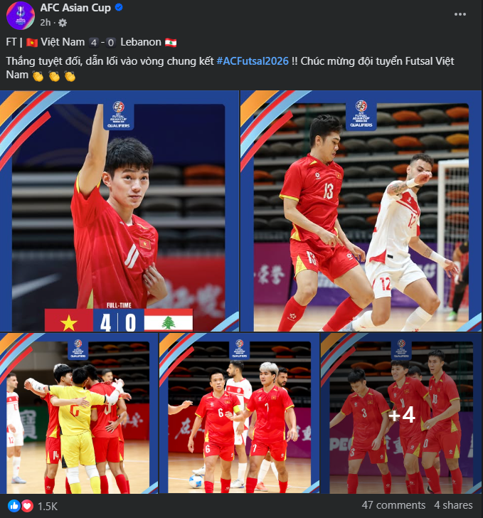 Right after the match ended, the Asian Football Confederation (AFC) sent their congratulations to the Vietnam futsal team: "A perfect win leading the way to the #ACFutsal2026 finals!! Congratulations to the Vietnam Futsal team", the AFC Asian Cup homepage shared. Below the post, many local fans expressed their support and praise for the players.
