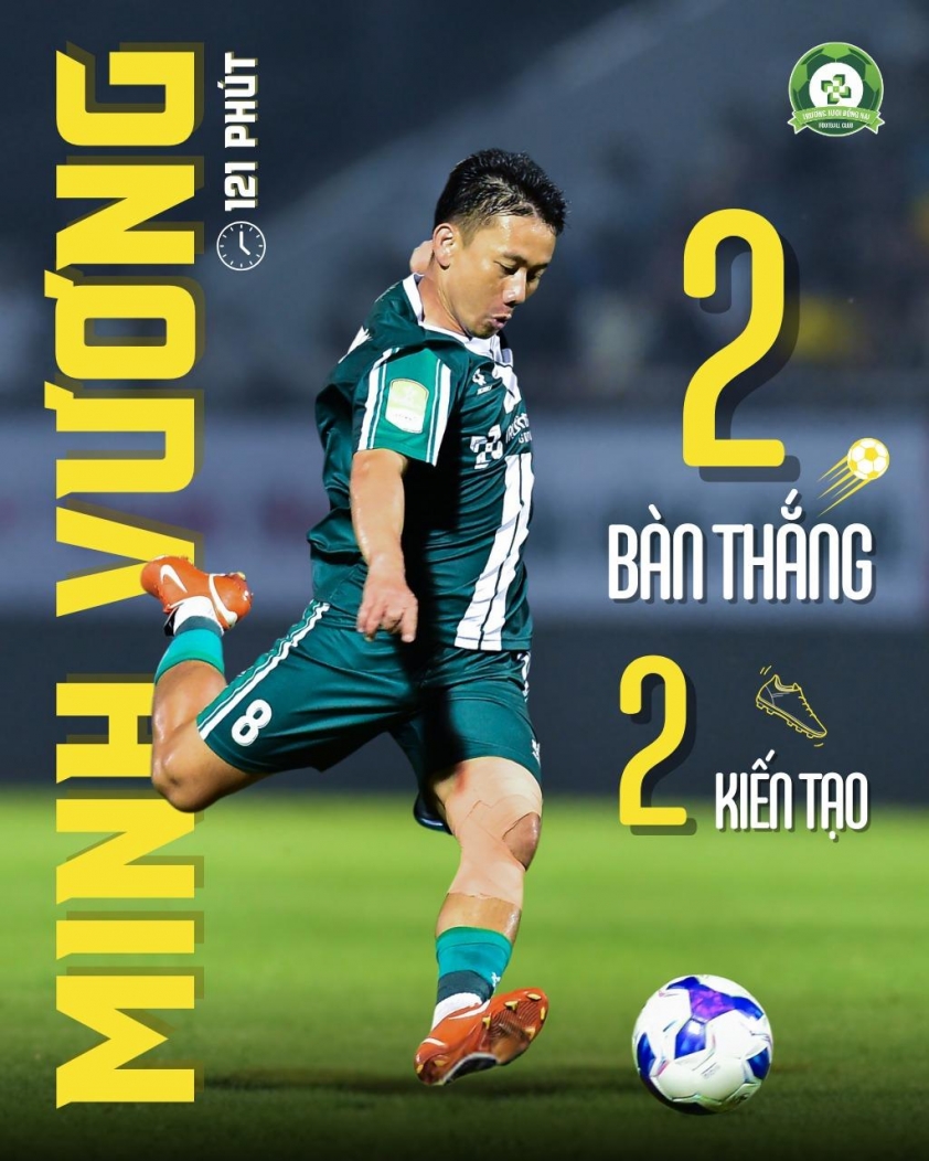 Having joined the club recently, Minh Vương is demonstrating quick and effective adaptation. In just 121 minutes of official play over two matches, he contributed 2 goals and 2 assists, becoming a key player in the attacking strategy of the Green Warriors.