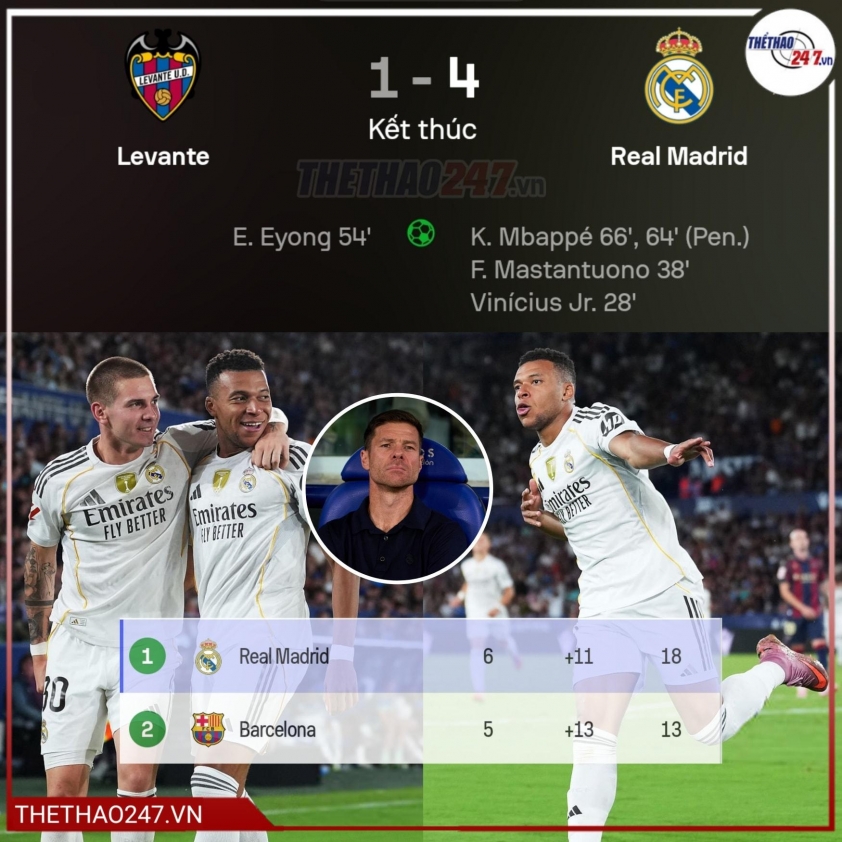 In the second half, Levante sparked hope with a goal to make it 1-2, but Mbappe quickly extinguished it all. Within three minutes (64 and 67), he scored twice, including a cool penalty and a classy solo effort past goalkeeper Mathew Ryan.