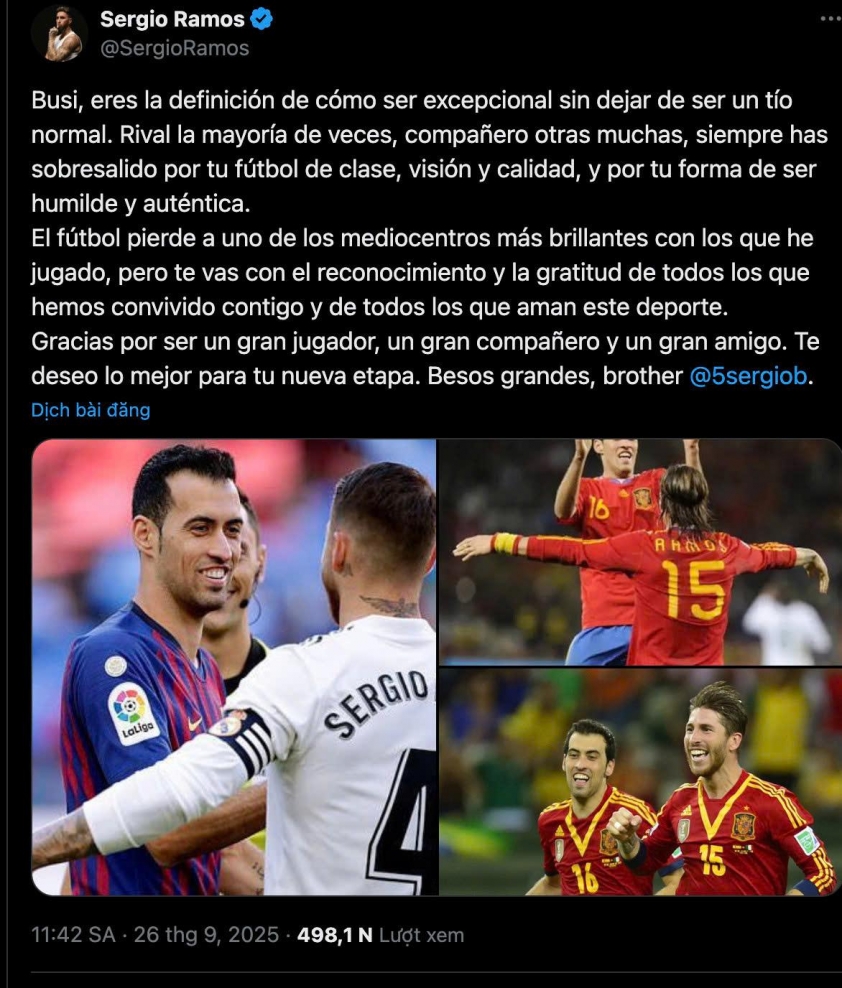 Ramos and Busquets have been closely linked to Spanish football for over a decade. Together, they experienced many highs and lows with the national team, highlighted by their 2010 World Cup victory. Despite frequently facing each other in intense El Clasico matches between Real Madrid and Barcelona, they always maintained mutual respect and a strong friendship.