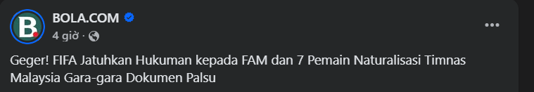 Indonesia's Bola newspaper expressed surprise at this news: "Chaos! FIFA punishes the Football Association of Malaysia (FAM) and seven naturalized Malaysian players for forged documents"