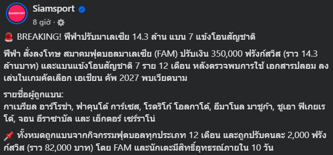 In Thailand, the Siam Sport highlighted the severe punishment Malaysia will endure: "BREAKING NEWS! FIFA fines Malaysia 14.3 million Baht and bans seven naturalized players