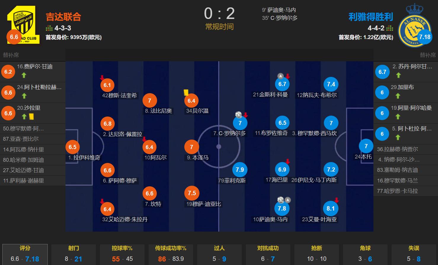 In this match, Ronaldo-led Al Nassr aimed for the title, playing as visitors but dominating Jeddah United. Although they didn’t control possession, they created more shooting chances. Notably, Al Nassr’s left-back Yehya showed strong attacking traits, combining effectively with left winger Mane. Mane scored and assisted, opening the scoring in the 9th minute with a volley from Coman’s cross, then in the 35th minute after feints, he crossed for Ronaldo’s header goal, putting Al Nassr 2-0 up—the final score. Al Nassr’s 2-0 away win over Jeddah United in this top-table clash knocked out the defending champions and put them alone atop the league. This was Ronaldo and Al Nassr’s championship statement, though Ronaldo’s missed open goal prevented a brace—this was the only regret in the match.