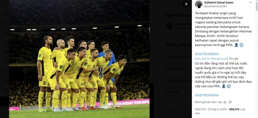 On September 25, one day before FIFA officially issued sanctions against Malaysia, journalist Zulhelmi Zainal Azam (Astro Arena, Malaysia) posted on social media: “There are rumors that certain forces are attempting to accuse FAM (Football Association of Malaysia) due to Malaysia’s rise related to the number of naturalized players. These forces seem to have close ties with senior FIFA officials.”