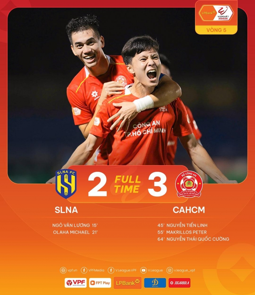 SLNA then pushed hard to find an equalizer but faced a tight defense from the visitors. Their efforts were in vain, and the match ended with a dramatic 3-2 win for CA TP HCM.