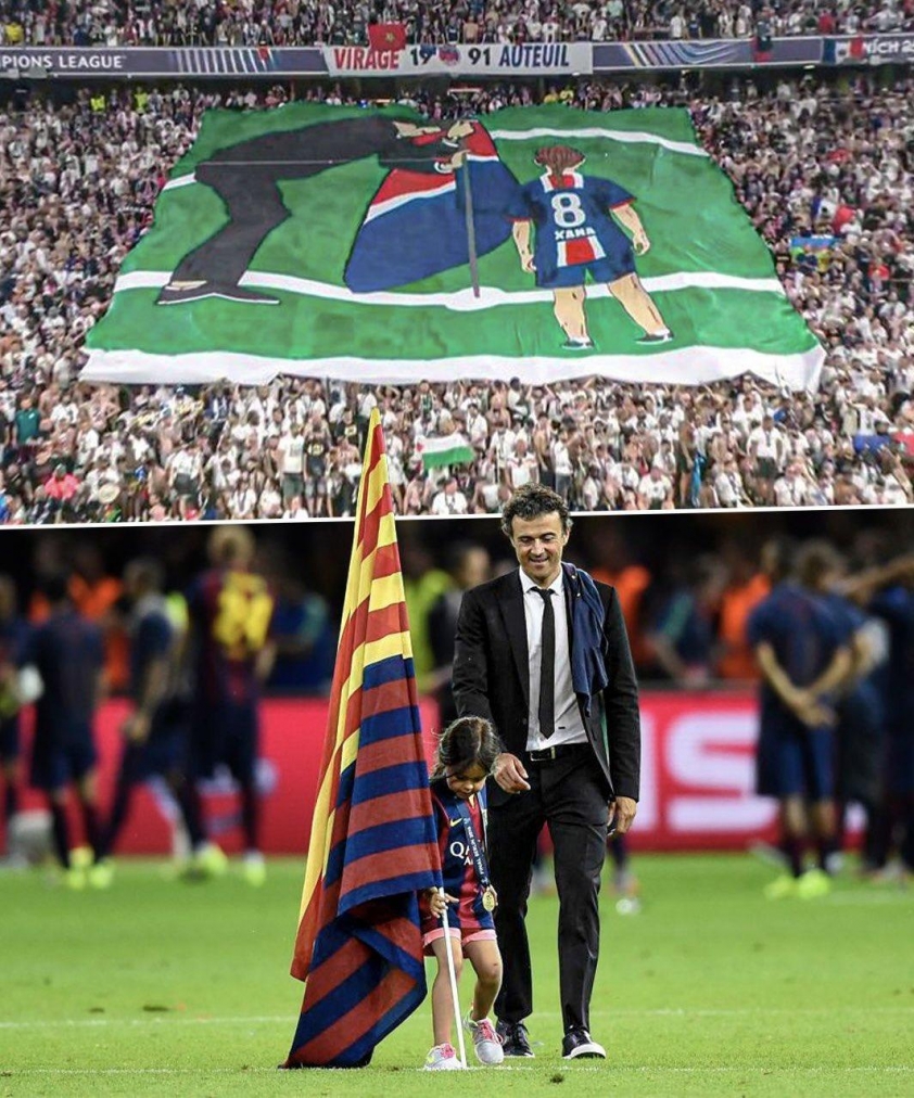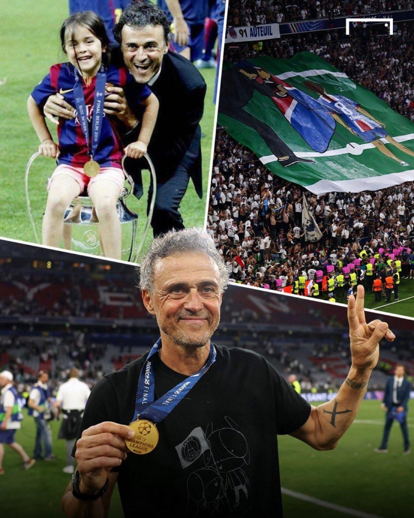 Recalling the 5-0 victory over Inter that helped PSG win the Champions League for the first time, coach Luis Enrique changed into a black T-shirt printed with an image of him and his daughter Xana planting the PSG flag on the field. That emotional moment deepened after the trophy ceremony when a huge tifo appeared in the stands depicting Enrique and his late daughter.