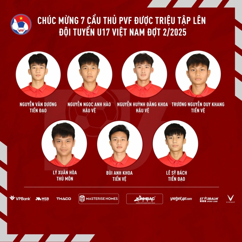Besides PVF, SLNA also announced 5 players—Phan Đăng Huy, Quán Thành Công, Nguyễn Minh Thủy, Hoàng Minh Lợi, and Trần Ngọc Sơn—called up to Vietnam U17. Although SLNA U17 only reached the quarterfinals of the 2025 Asian U17 Championship, 5 players from the Nghệ An club were still included by coach Cristiano Roland in the preliminary squad preparing for the 2026 U17 Asian qualifiers.