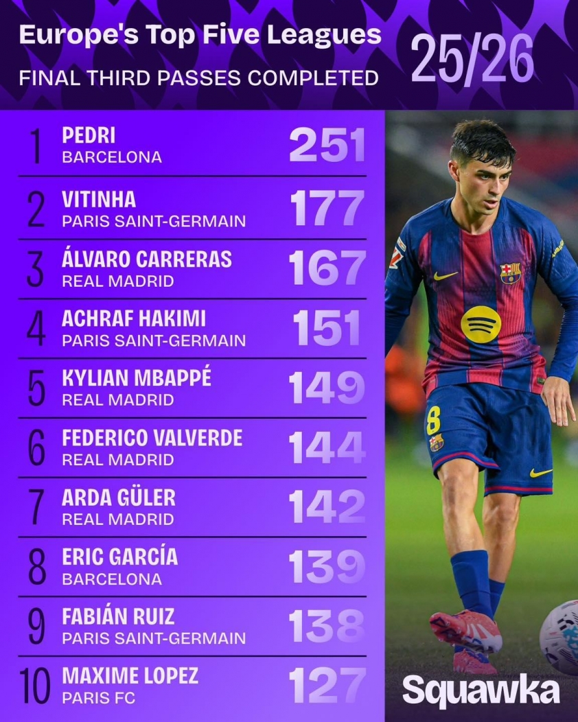 In La Liga, Pedri has completed 711 successful passes, 167 more than the second-ranked Alvaro Carreras (544). This gap highlights his absolute dominance in ball distribution. Flick highly praises his all-around role: “He is truly special. He brings leadership, appears everywhere on the pitch, and has the potential for a remarkable season.”