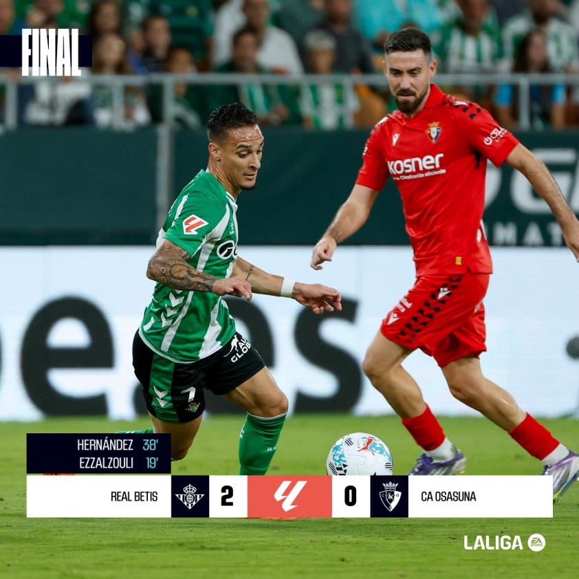 In the second half, Osasuna pushed hard to find a goal. They raised their attacking line and made several substitutions, but impatience led to inaccurate shots. Betis maintained a solid defense, controlled the match, and preserved their advantage until the final whistle. Ultimately, Real Betis won 2-0, a result that truly reflected their superior play and effective exploitation of the opponent’s mistakes.