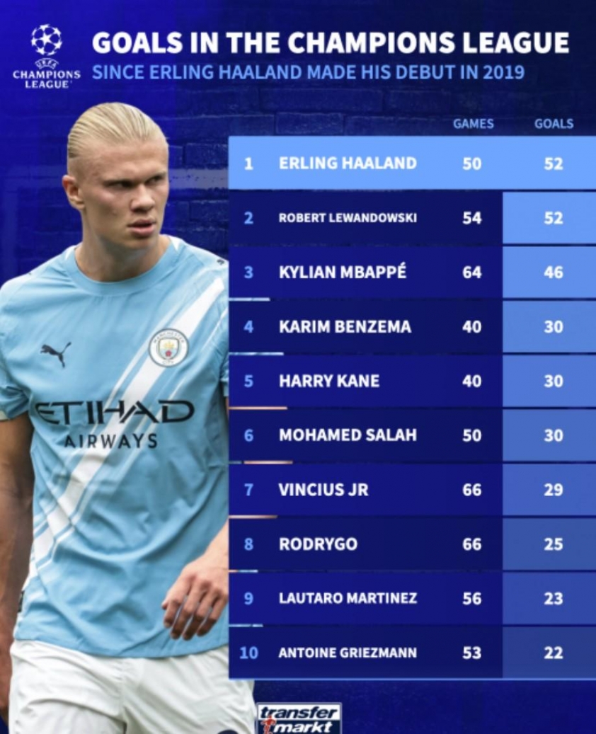 Erling Haaland continues to astonish Europe as he hits 52 goals after only 50 Champions League appearances, outperforming every forward of his era.