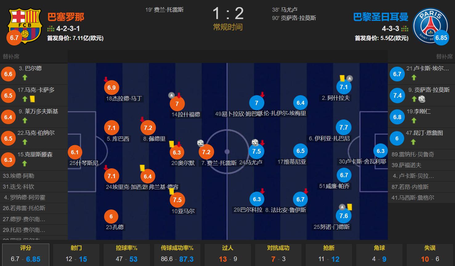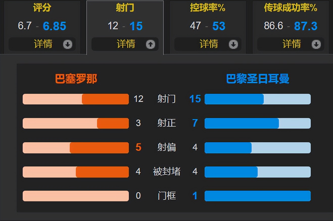 Throughout the match, Paris held 53% possession, took 15 shots with 7 on target; Barca had 12 shots with 3 on target.