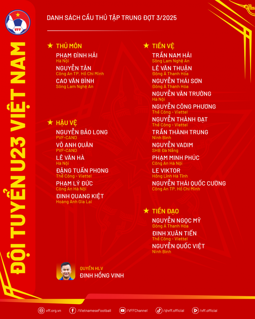 Besides these newcomers, the Vietnam U23 team retains familiar faces such as Phạm Lý Đức, Lê Văn Thuận, Nguyễn Văn Trường, and Nguyễn Ngọc Mỹ — players who made notable impacts during the U23 Asian qualifiers.