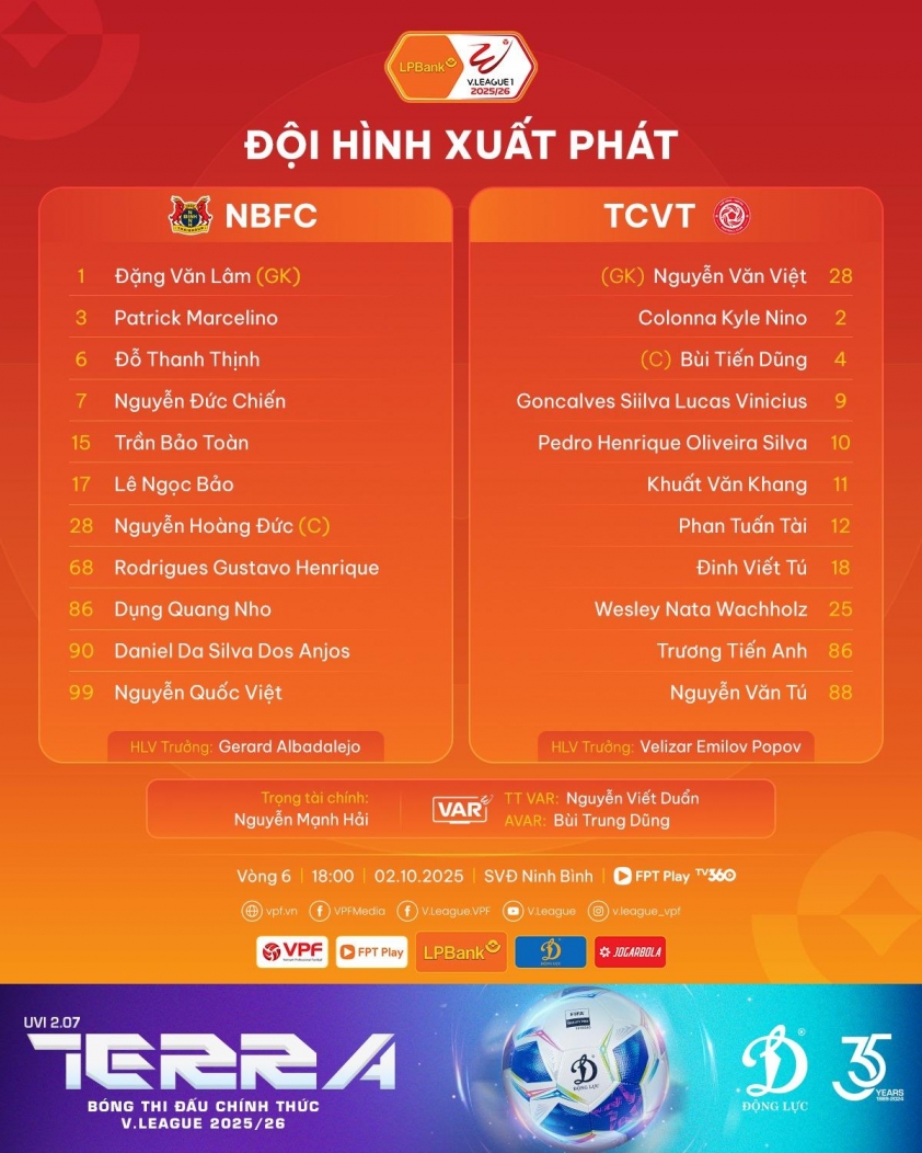 As mentioned, Ninh Bình FC (13 points) will face Thể Công Viettel (11 points), surely the most anticipated match of this round for local football fans. Both remain unbeaten after 5 rounds, especially Ninh Bình FC – a newcomer – who have shown impressive form, even defeating the defending champion Thép Xanh Nam Định in the "Ninh Bình derby".