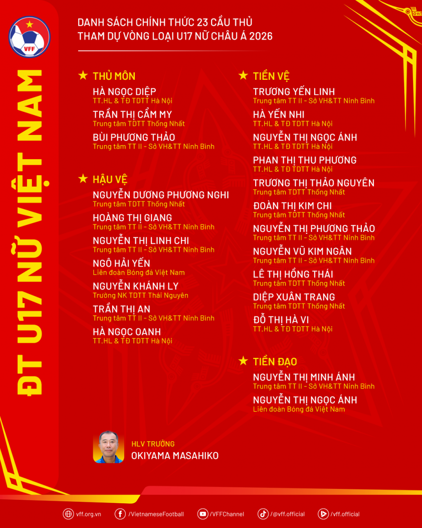 The Vietnam U17 women's team has finalized a list of 23 players for the 2026 U17 Women's Asian Championship qualifying round – Group D.